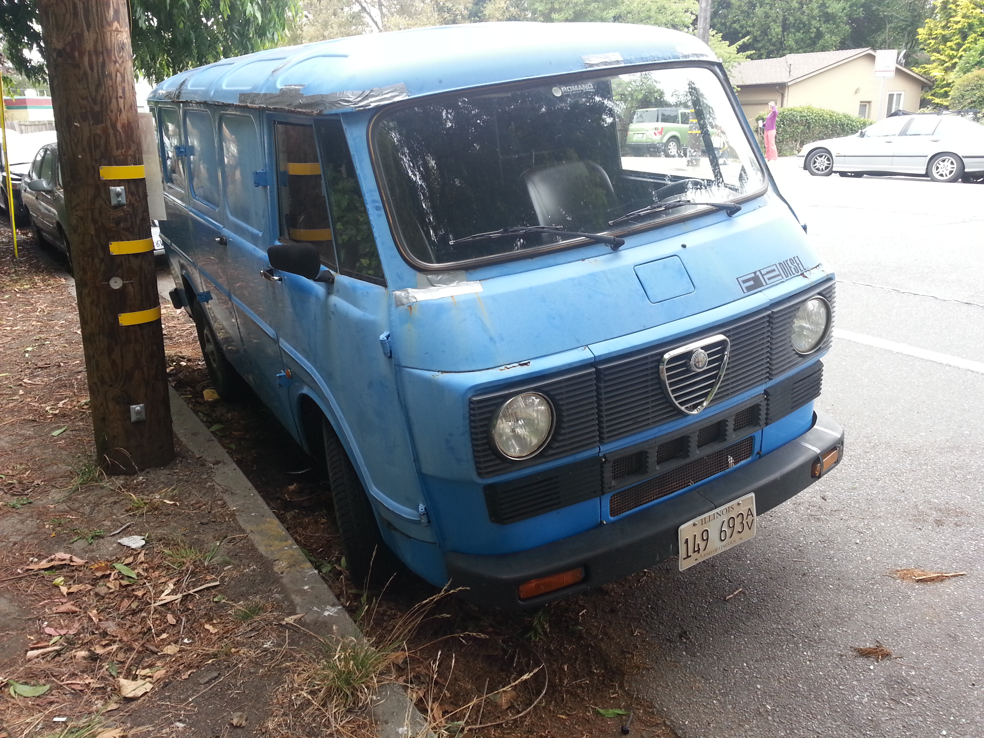 This 1979 Alfa Romeo F12 diesel van recently returned to California, under the influence of Andrew Watry, keeper of the Alfa Romeo Berlina Register. Powered by a 1.8 liter Perkins diesel with 50hp, it’s Alfa Romeo’s interpretation of the VW bus, with a three-spoke steering wheel, twin pod gauge cluster, and Alfa handling. Built from 1967-83, this one is a series two van with the black plastic grill and adhesive sticker badging.