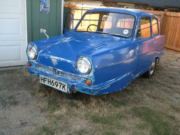 Interesting – the seller says this car qualifies for a motorcycle registration here as well, and it’s got the plate to prove it. To quote him on something else, “Frankly, the thing’s a mess.” It’s interesting to see how much photos can also hide, because the car’s definitely looks like it’s been rubbed down to the primer, but perhaps what you’re really seeing is a mass of stress cracks in the fiberglass. The car is also said to need new tires, and has an overheating problem. The car shares its reverse-canted rear screen with the Ford Anglia, and indeed shares many styling cues with other British cars of its time.