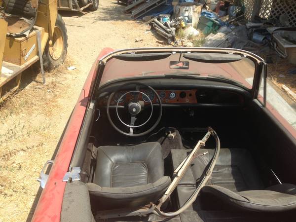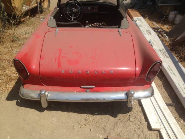 About 20 years ago when it was still not unusual to see British cars (made by a British conglomerate, not an American, Indian, or German one) on the road, Sunbeam Alpines were already a fairly unusual sight. Very distinctive for their fins, and somewhat more luxurious than a contemporary MG or Triumph, they were not in the mainstream and suffered from a reputation for not being a true sports car. However, by contemporary standards, the small luxuries make them usable by today’s standards. Alpines were built in several series, with the first 3 maintaining the rear fins that are part of what makes them similar to a Ford Thunderbird. Last to bear the fins, this 1964 Sunbeam Alpine Series III is for sale in sun Valley, CA for $3200.