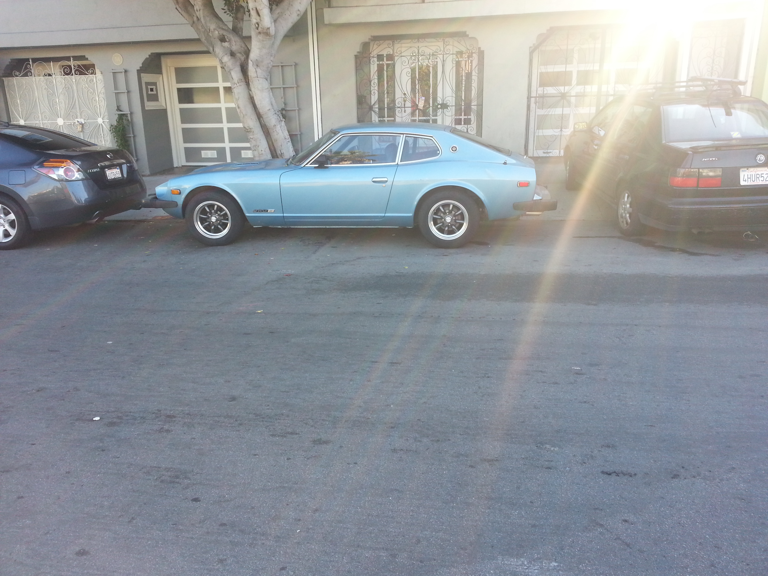 Next up are the rays of heaven shining down upon this mid-1970s Datsun 260Z. Looking nice in pale blue with contrasting gray Minilite-style wheels, this car has been featured on other sites and may have been a feature on BringATrailer a few years back. It seems to be in regular use, and lives near a similarly nice 1974 BMW 2002tii – perhaps an owner who wanted two 1970s icons for himself.
