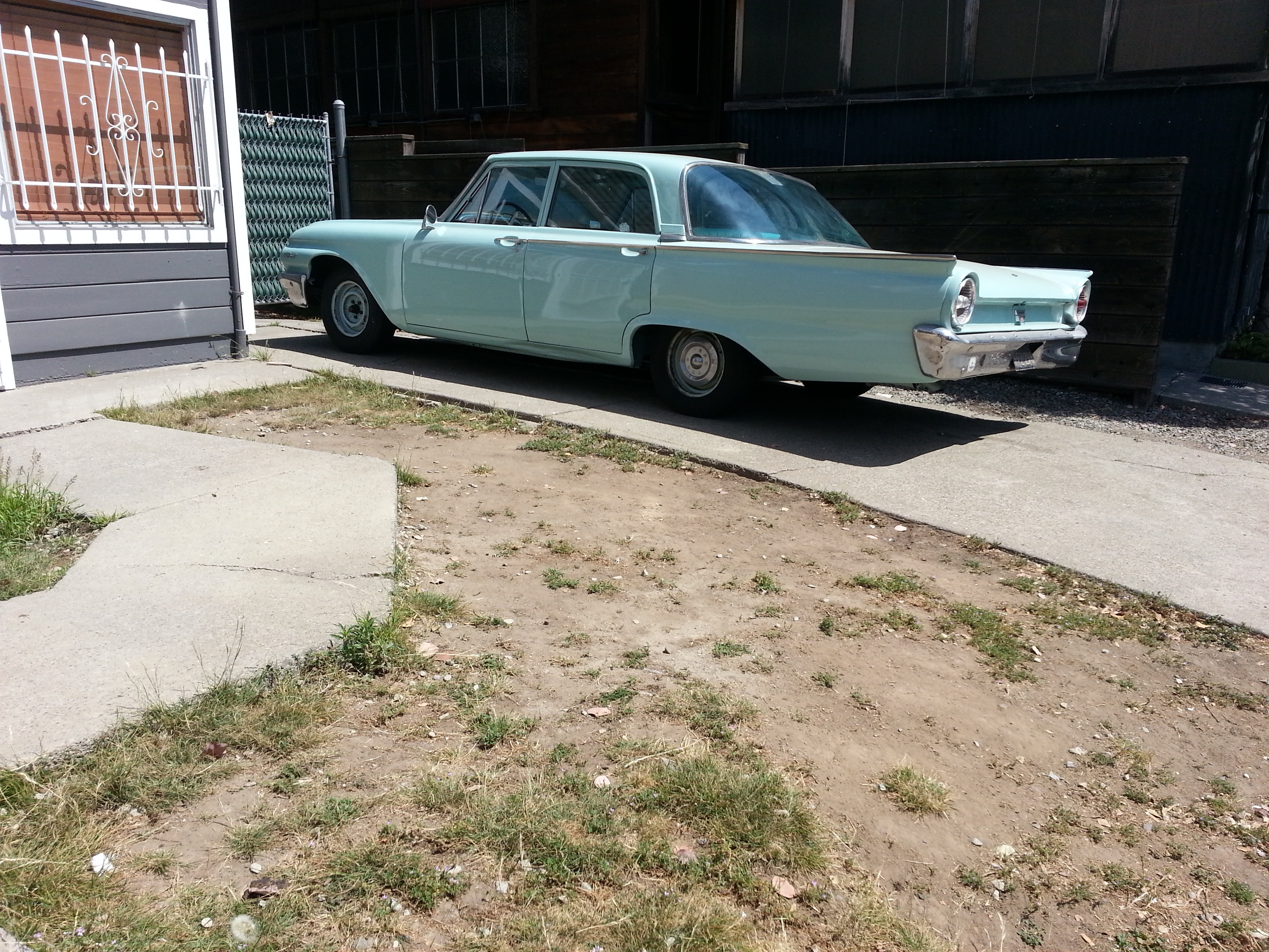 The Ford is a 1961. I’m going to guess it is the base full-size model, the Custom 300, rather than the Fairlane 500 or top-line Galaxy 500. I learned to drive on a 1961 Ford Country Sedan (wagon) in this same color and with those same hubcaps (but wheels would originally be painted body color).