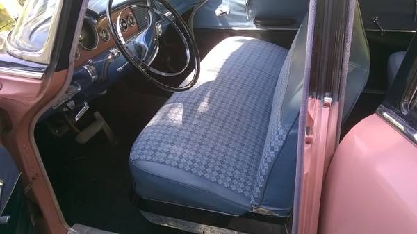Royalty was clearly the Chrysler way of achieving an aura of prestige around their metal – the Imperial, Windsor, Royal, and Custom Royal were all names used in that period. That and chrome, and lots of it – on the bumpers, on the hood, the hood ornament, the body side trim, the hubcaps, the mirrors, and the door handles. The car is said to have 60,000 indicated miles, though the seller admits this might not be the true mileage. The body is finished in rose (it’s not pink! my car is not pink!) with black on the roof and center of the hood, giving it quite some presence. Somehow, the pink finish does not look as vulgar as on the stereotypical 1959 Cadillac – perhaps it’s the smaller size of the car, or those black accents, that help tone it down.