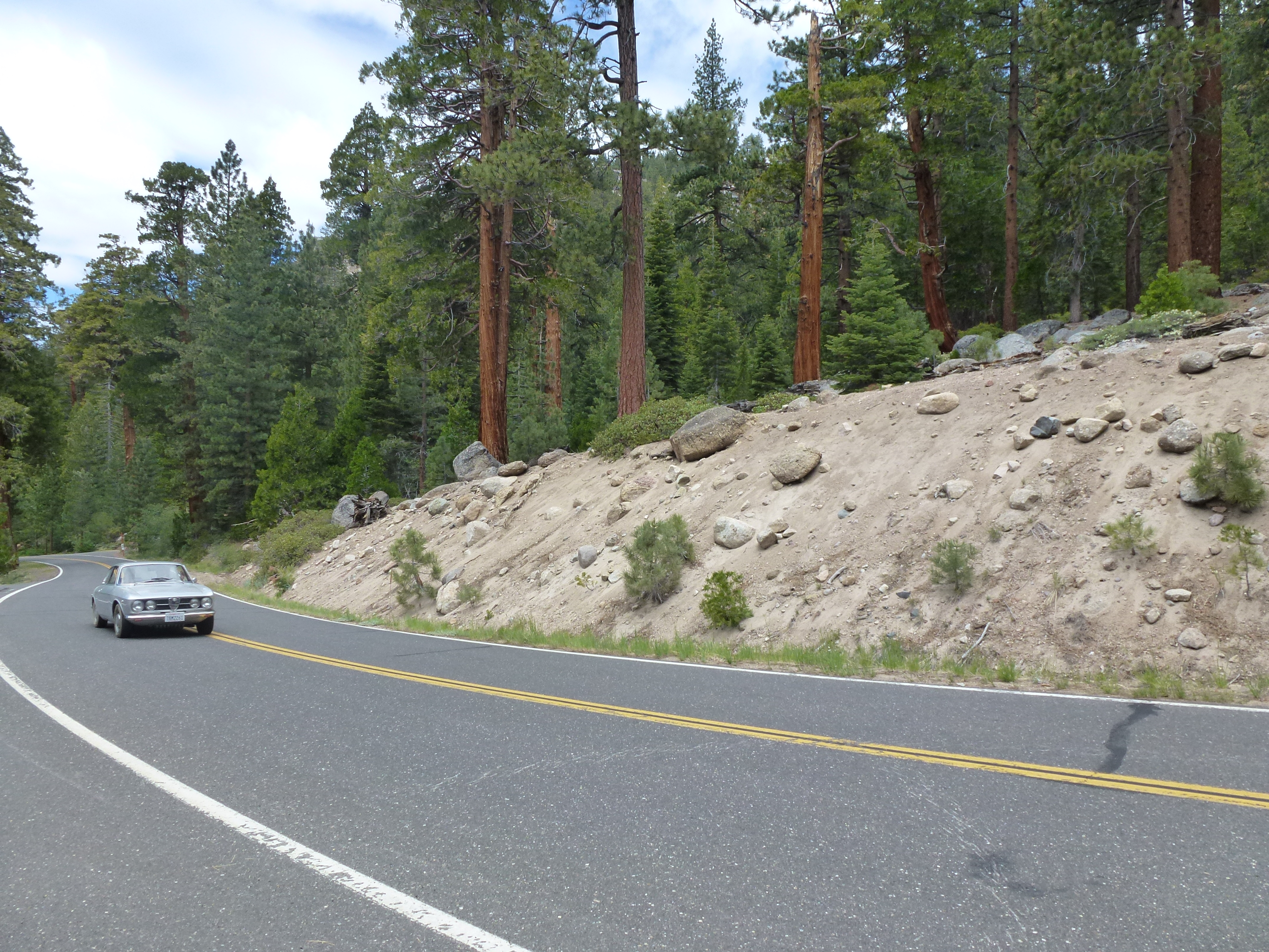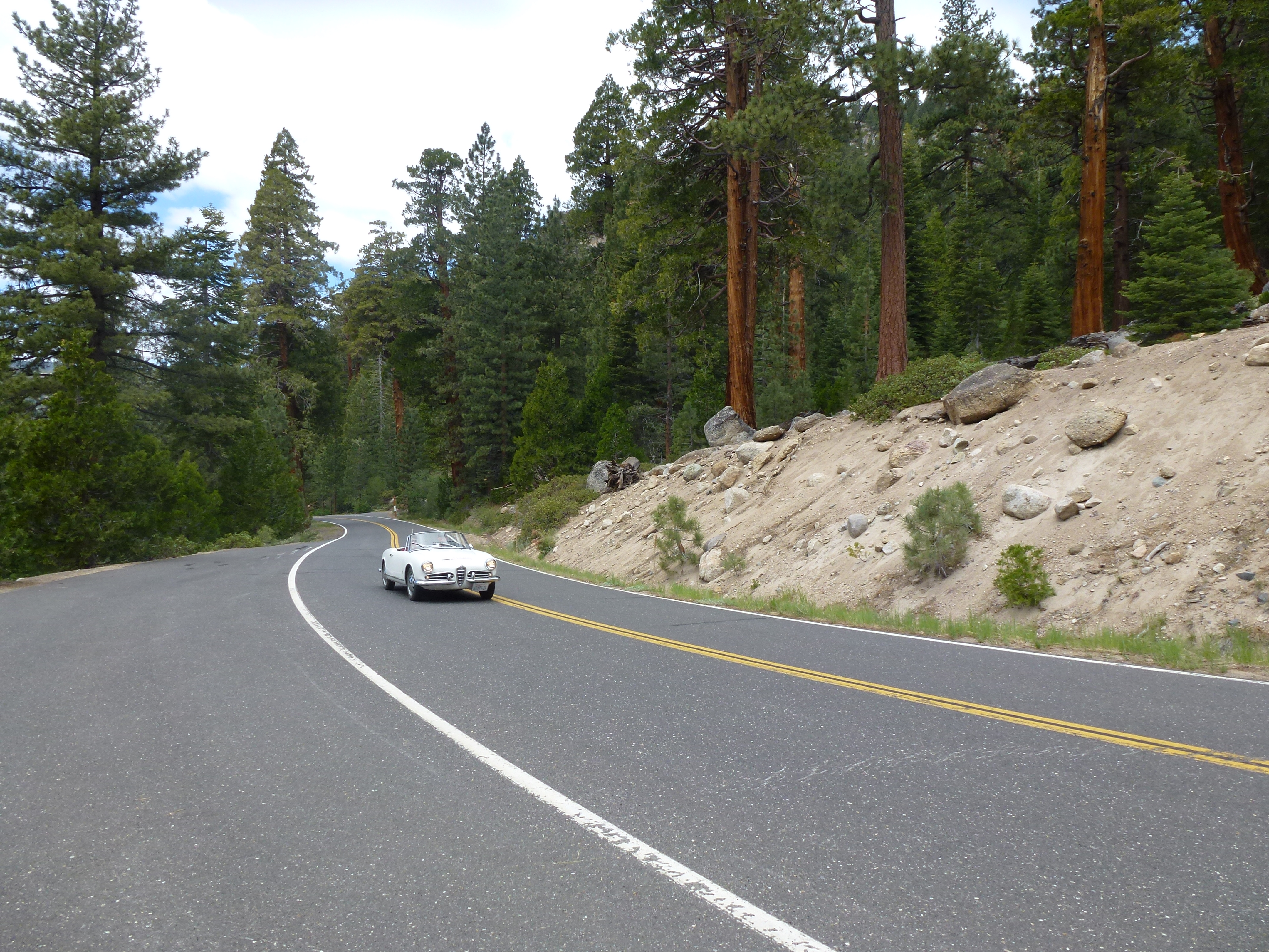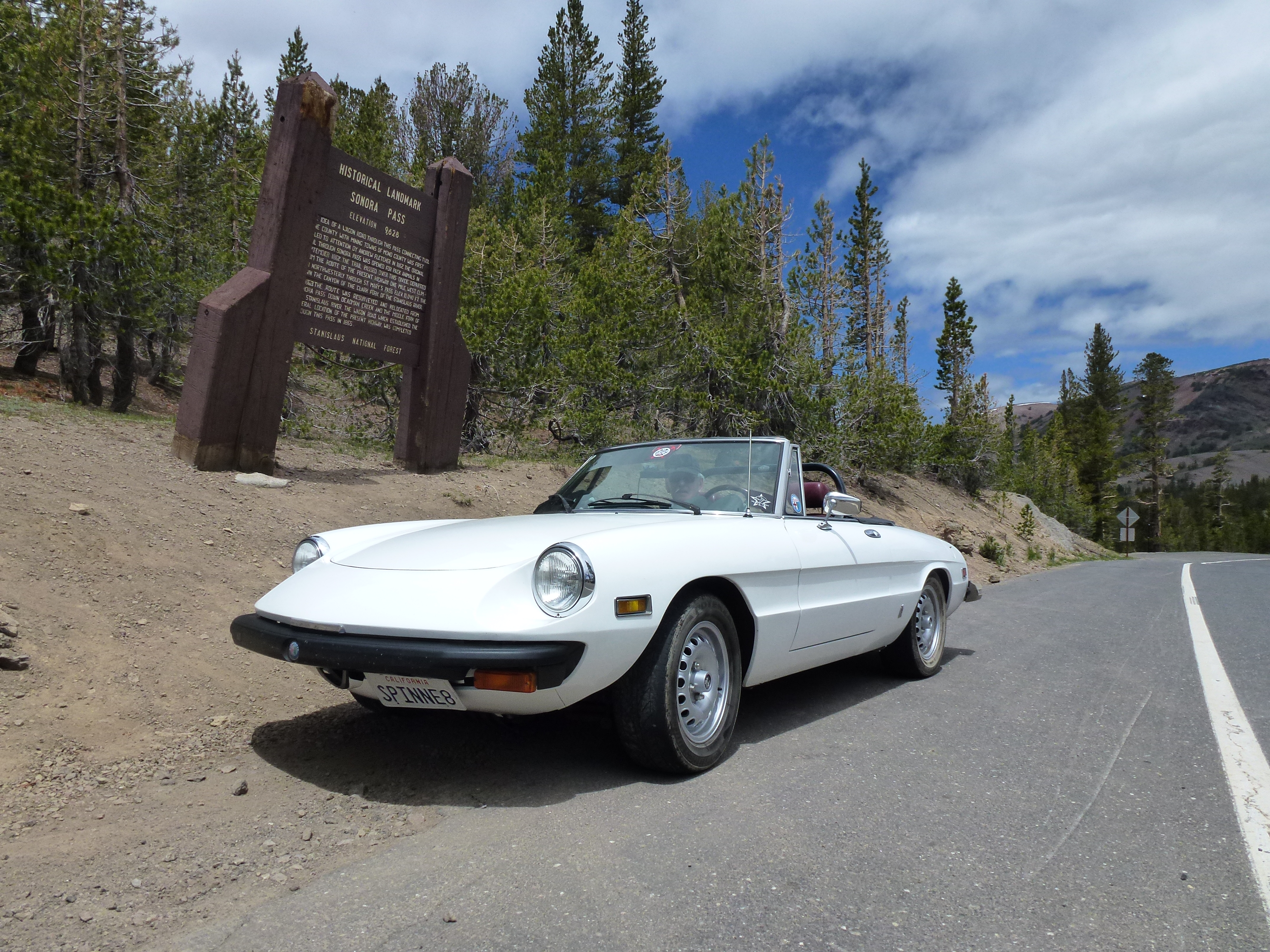 On the climb up into the Sonora Pass, the spider was running lean, requiring a few stops along the way to let things cool down. This netted a couple of nice pictures, including this one of an Alfa Giulia 1600 spider. Though originally blue, it’s now finished in white, which seems to work very well on the Giulietta/Giulia shape.