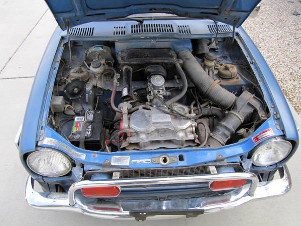 The interior is complete and fairly clean, but the economy car materials are certainly showing their age. Part of the headliner and some weatherstripping has gone missing, likely reducing the car’s 1312-lb. weight to 1306 – not much for a 36hp engine to move around. The aft end of the driver’s door is showing some kind of odd damage, either to the metal or the paint, so you’ll want to clarify with the seller. The funky dash mounted shifter – the only one outside of a French car – is a neat feature.
