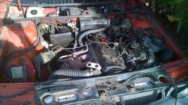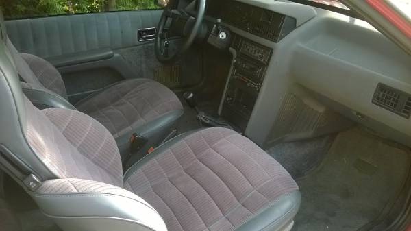 Showing a mere 70,000 miles on the odometer, this Fuego seems in much better shape than most surviving examples. It’s said to have spent a long time in a garage, and benefits from a new radiator, starter, timing belt, and water pump. The paint does look somewhat oxidized, but still retains its shine – perhaps a bit of polishing might bring its color back? Some flush headlights from a European market car would do a lot to update its look. The wood block suggests the handbrake needs work. Check out the nifty plastic whatchamacallits along the beltline – that design cue is almost as 1980s as louvered rear windows.