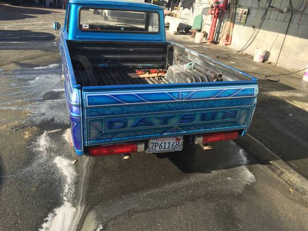 Much like it’s fun to try out different food, clothing style, or paint your house an unusual color, so it’s also fun to try out a style of car you might never normally own. Unfortunately, cars are usually expensive enough to prohibit that kind of thing, particularly cars where someone’s invested significant time or money to take them in a certain direction. So you probably won’t find many cars with kustom paint jobs that are under the self-imposed RustyButTrusty price cap, but with some patience you can find that 1980s custom minitruck of your dreams. Check out this 1972 Datsun 521 pickup for sale for $3500 somewhere on the peninsula south of San Francisco, CA.