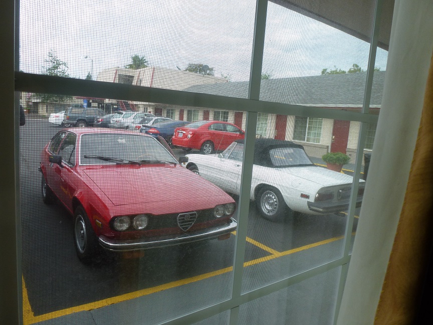 8 1979 Alfa Alfetta GT and 1977 Alfa Spider morning view at the Rodeway Inn
