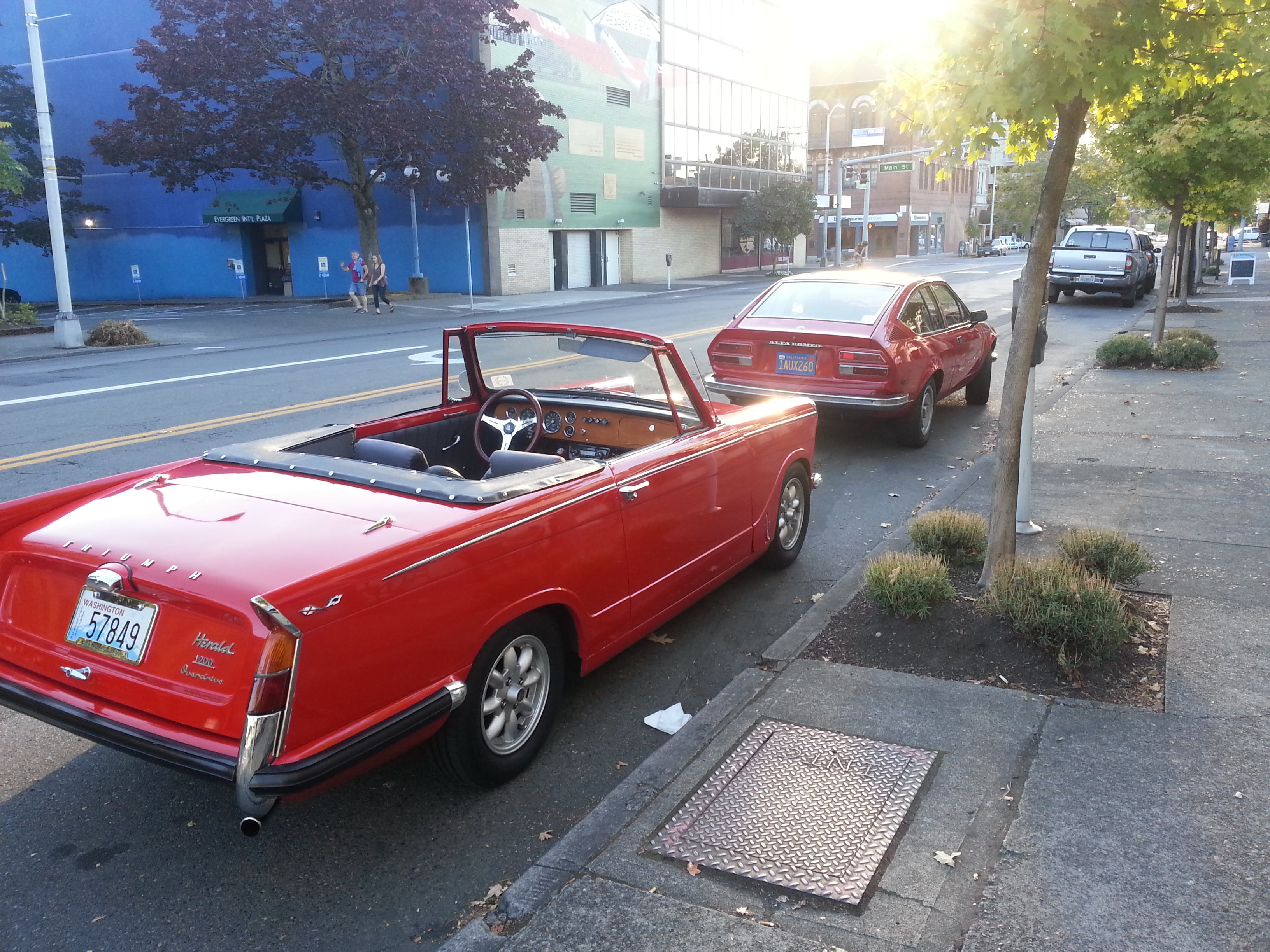 Is that a Triumph Herald and an Alfa Romeo Alfetta GT parked together? When’s the last time you saw something like that on the street? Never? Well, you’re welcome. This Herald is a gorgeous example, very clean looking and tastefully lowered over Panasport wheels. It’s nice to see it in this shape, as most of them are either ratty projects or preserved originals.