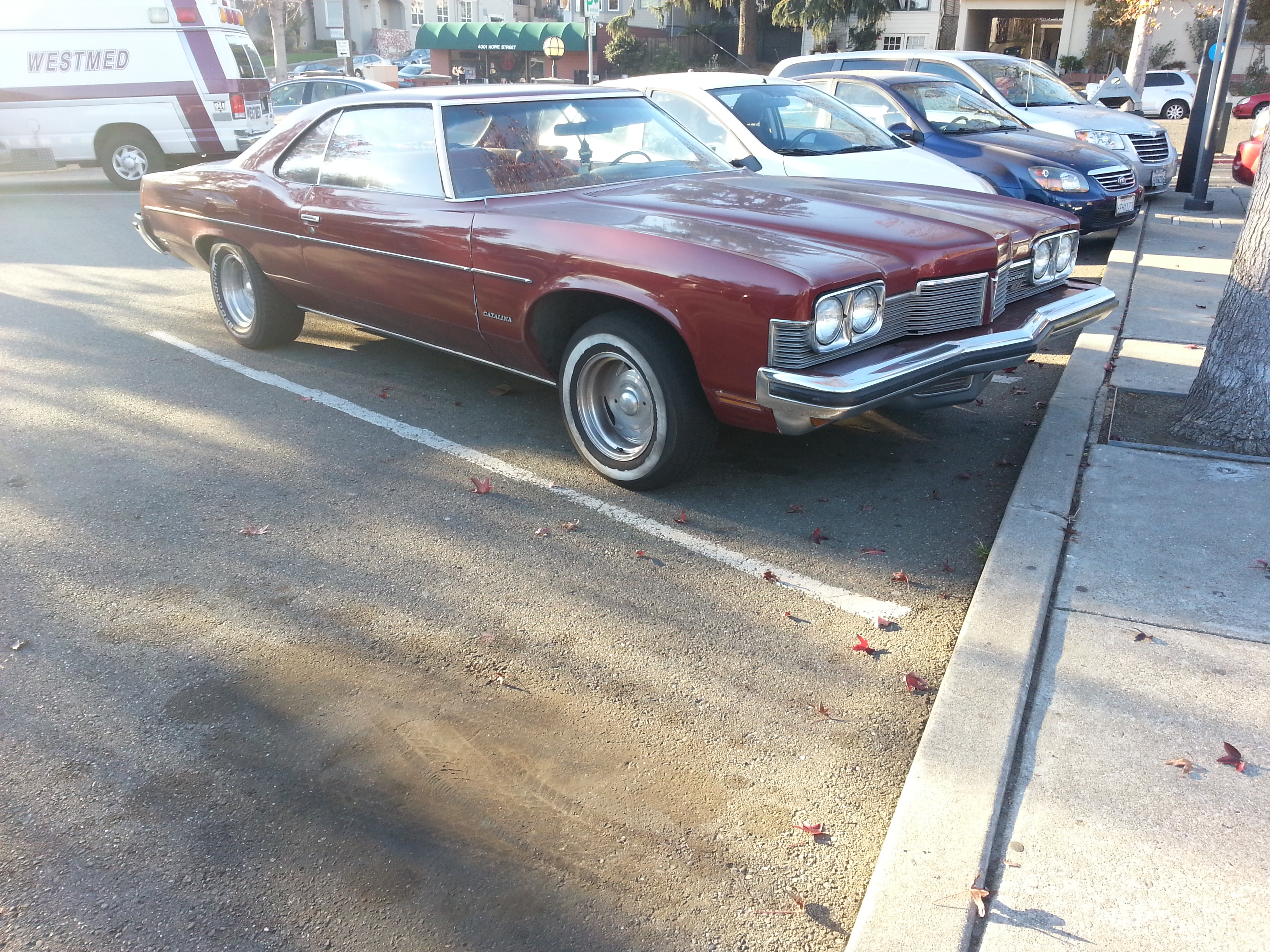 As San Francisco is an interesting place for spotting unusual (or at least old) cars, so are Oakland and Berkeley. And for people who live where interesting cars are a not-too-uncommon sight among the hoardes of Priuses, Accords and F150s, you owe it to yourself to not forget to appreciate where you are. Our first car is a 1973 Pontiac Catalina coupe. Wait, you say, Pontiac? Sure, they’re an orphan brand now, but there are loads of those still on the streets! Well, with attrition, some of the less-popular versions of the General’s platforms have become as rare as cars that had much-lower sales numbers when new. Who knows what engine this car has in it – anything from the 350 to the 455, with a less-than-impressive horsepower range of 150 (boohoohoo) to 250 (meh).