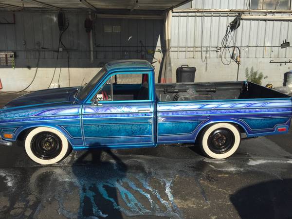 September 10, 2015Much like it’s fun to try out different food, clothing style, or paint your house an unusual color, so it’s also fun to try out a style of car you might never normally own. Unfortunately, cars are usually expensive enough to prohibit that kind of thing, particularly cars where someone’s invested significant time or money to take them in a certain direction. So you probably won’t find many cars with kustom paint jobs that are under the self-imposed RustyButTrusty price cap, but with some patience you can find that 1980s custom minitruck of your dreams. Check out this 1972 Datsun 521 pickup for sale for $3500 somewhere on the peninsula south of San Francisco, CA.